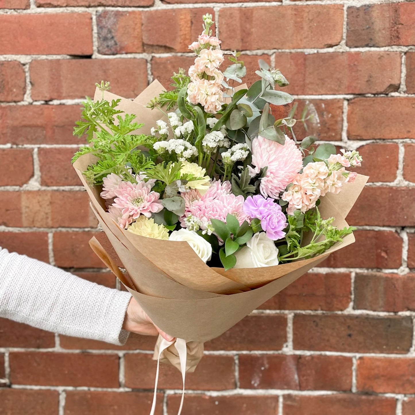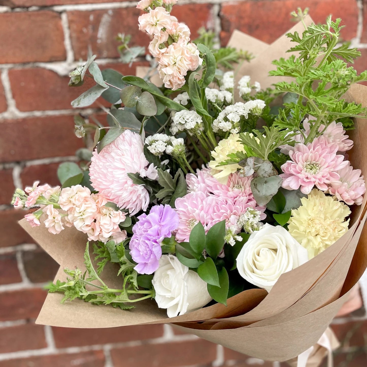 This arrangement can include fluffy peony mums, carnations, lisianthus, stock and statice, nestled in locally grown gum and other foliage.